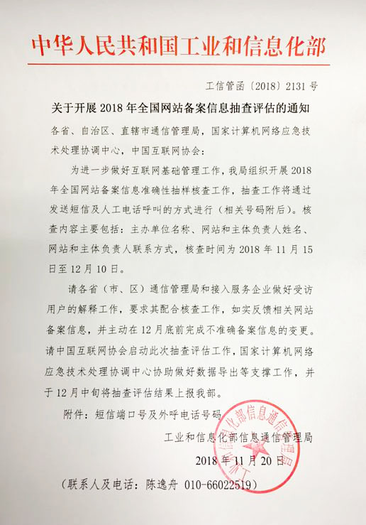 為進一步做好互聯(lián)網(wǎng)基礎(chǔ)管理工作,工業(yè)和信息化部通信管理局組織開展2018年全國備案信息準確性抽樣核查工作,抽查工作將通過發(fā)送短信及人工電話呼叫的方式進行。核查工作發(fā)送短信端口號碼為:電信:106598051001、移動:106575000130、聯(lián)通:10655113,核查使用電話號碼為:0755118322、02296599818。核查內(nèi)容主要包括:主辦單位名稱、網(wǎng)站和主體負責(zé)人姓名、網(wǎng)站和主體負責(zé)人聯(lián)系方式,核查時間為2018年11月15日至12月10日。